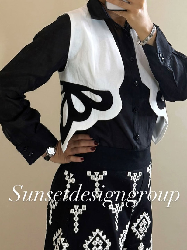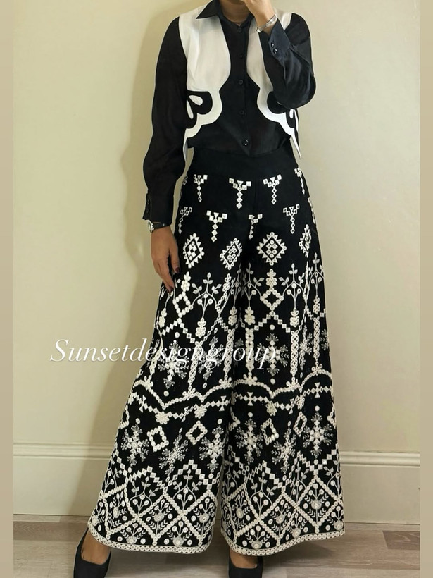 جنس شلوار لینن سوزندوزی و آینه دوزی هندی نفیس. جنس شومیز حریر شیمر. جنس وست لینن لایی خورده و آستردار تکه دوزی شده.