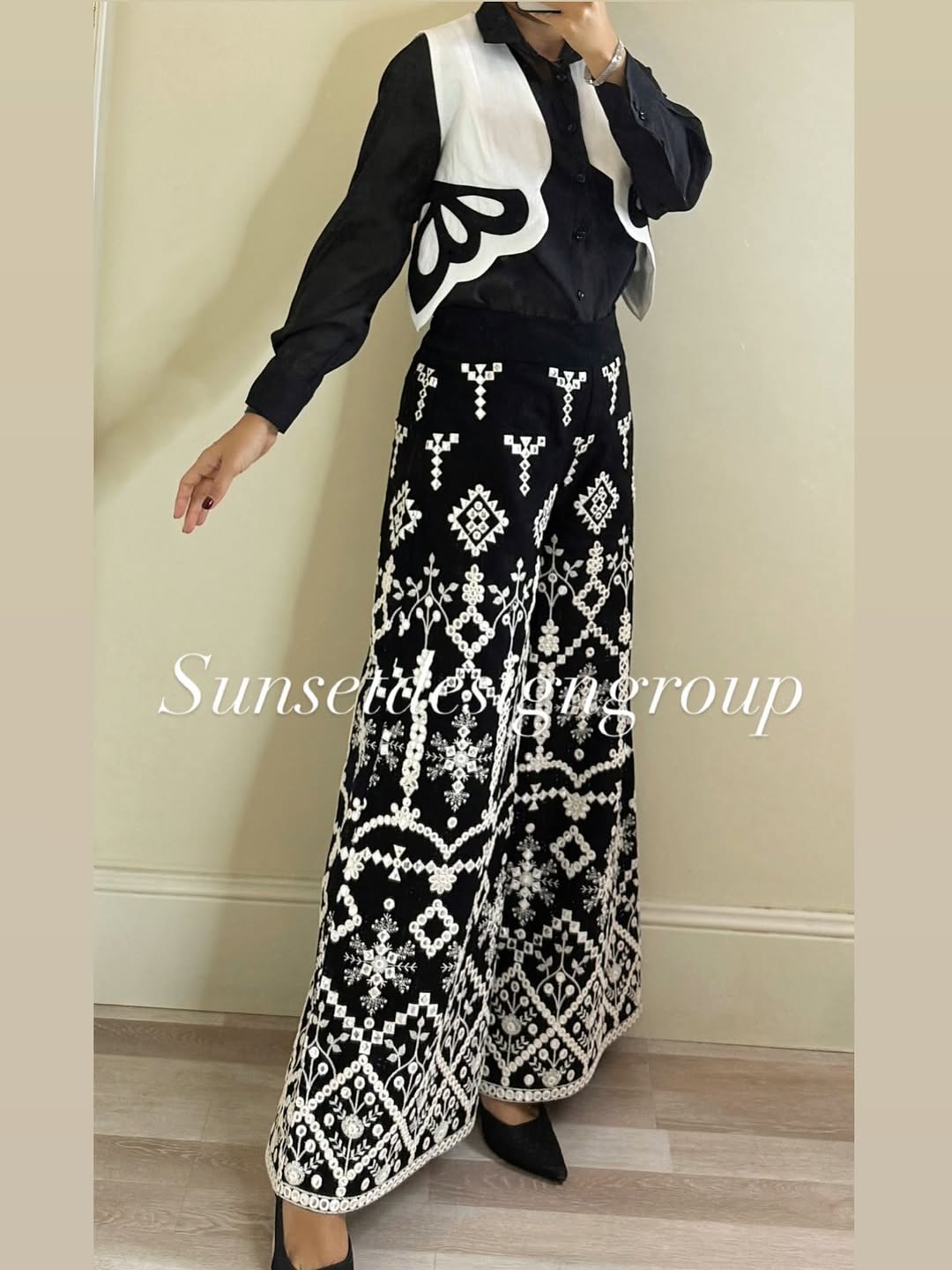 جنس شلوار لینن سوزندوزی و آینه دوزی هندی نفیس. جنس شومیز حریر شیمر. جنس وست لینن لایی خورده و آستردار تکه دوزی شده.